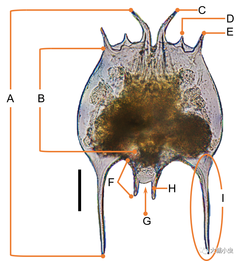前棘刺(anterior spine):一般指臂尾輪屬背甲前部的棘刺, 從中間向兩側(cè)成對(duì)排布依次為前中棘刺(anterior medial spine)(圖C)、前亞中棘刺(anterior submedial spine) (圖D)、前側(cè)棘刺(anterior lateral spine) (圖E)。后棘刺(posterior spine):分布在被甲后端兩側(cè)的棘刺(圖I)。足孔棘刺(spine of foot opening):分布在足孔兩側(cè)的棘刺(圖H)。