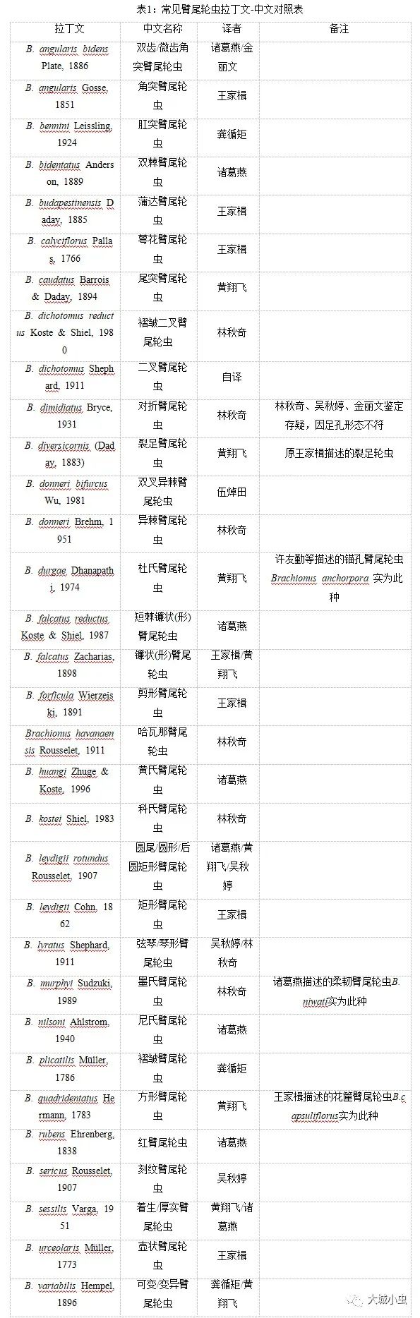 在世界范圍內(nèi)存在的臂尾輪屬的種、亞種、變種共有118種(Ahlström, 1940),我國常見約30余種(王家楫, 1961; 蔣燮治等, 1983; 章宗涉等, 1991; 諸葛燕, 1997; 許友勤等, 1997; 吳秋婷, 2012; 金麗文, 2013; 林秋奇, 2017)。由于鑒定種類增加,原有種類的再鑒定,致使中文名稱發(fā)生了變動(dòng),但許多鑒識(shí)人員無法判斷拉丁文名稱所對(duì)應(yīng)的已有中文名,現(xiàn)就此做出梳理,詳見下表。