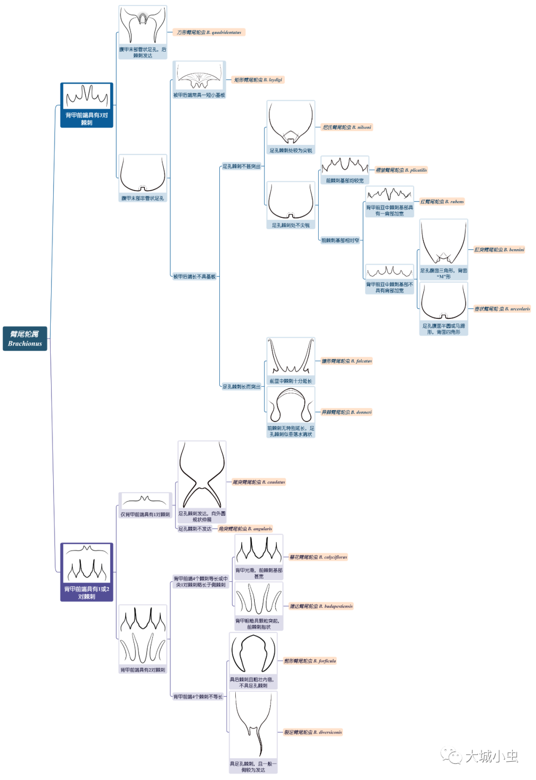 因臂尾輪屬在生態(tài)鑒定中特殊的地位,以及常見種類中文名與拉丁文名的對(duì)照不完善等問題,以下內(nèi)容以展示臂尾輪屬常見物種為例,以檢索方式加以劃分;并對(duì)該屬常見物種的中文與拉丁文相互對(duì)照,達(dá)到輔助鑒定人員辨識(shí)該類群的目的。